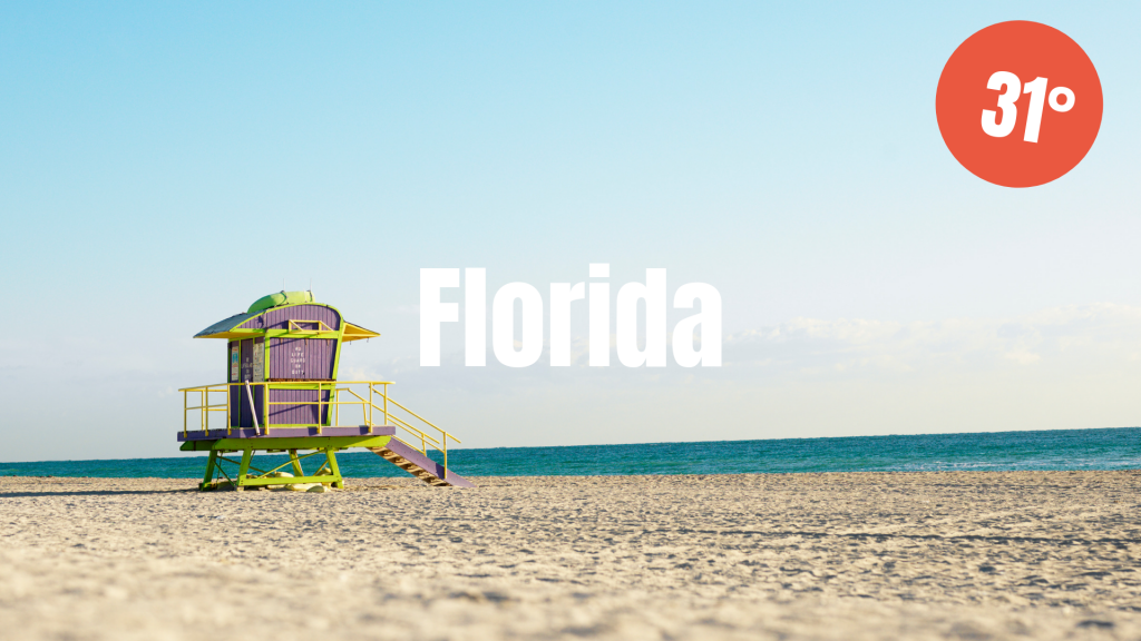 Åker du till Florida i maj kan du se fram emot 31°C och sol! Temperaturen sjunker till mycket behagliga 20°C nattid. Få länder har lika breda stränder som USA och ett besök på någon av Floridas många alternativ är ett definitivt måste. Här kan du räkna med en medeltemperatur på 27°C i vattnet.