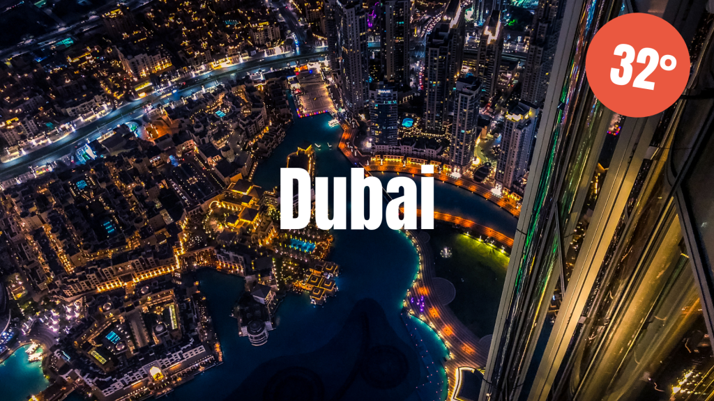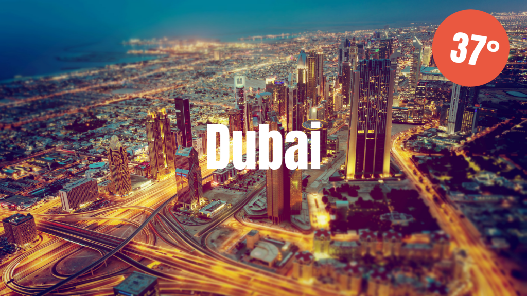 Dubai är ensam i sitt slag. Staden i Förenade Arabemiraten är extravagans och lyx beskrivet och bör finnas med på var mans önskelista över resmål att besöka. Redan i april noteras dagstemperaturer på i snitt 32°C och nattemperaturer på 20°C. Samtidigt är nederbörden nästintill obefintlig där Dubai har hela 27 regnfria dagar.