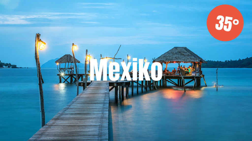 Vill man ha det riktigt hett är det andra sidan Atlanten som gäller. Mexiko har en genomsnittlig dagstemperatur på 35°C under april månad och hela 25 regnfria dagar. Vattentemperaturen ligger dessutom på i snitt 26°C, vilket lär få även den största av badkrukor att slänga sig i havet.