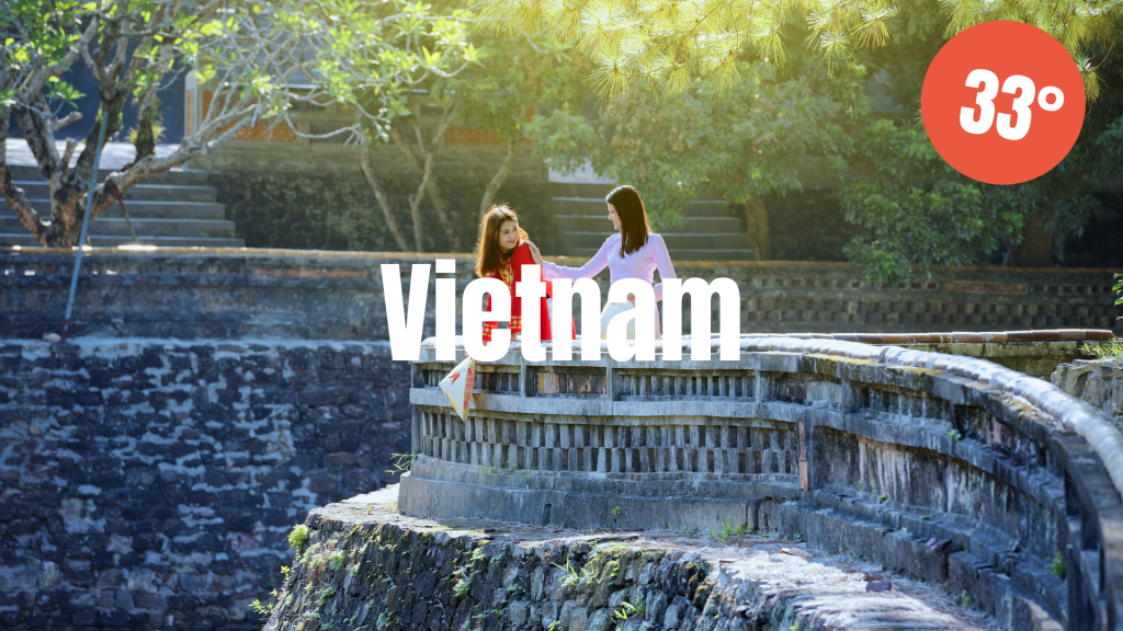Vietnam fortsätter att vara varmt i maj med en genomsnittlig dagstemperatur på 33°C. På kvälls- och nattid sjunker temperaturen till 24°C och du kan med fördel gå med bara ben dygnet runt!